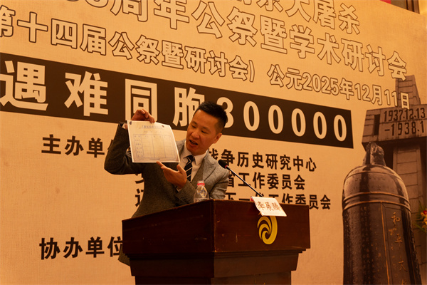 研讨环节中,李展腾展示了一份珍贵历史文献——“株式会社昭和工数实动报告合计票”,有力证实了日本侵华期间奴役中国劳工、掠夺矿产资源的罪行。中国近现代史史料学学会副会长张恺新指出,这份文献是驳斥日本右翼否认南京大屠杀谬论的重要证据。